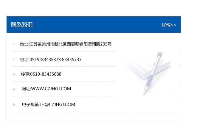 傳真:0519-83435688    郵編:213135    網址:WWW.czjhgj_com.atschme.com    電子郵箱:JH@czjhgj_com.atschme.com